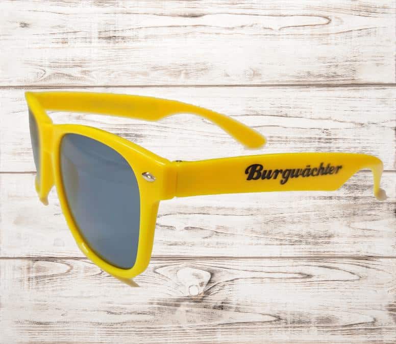 Gelbe Sonnenbrille mit gelasertem Burgwächter Logo.